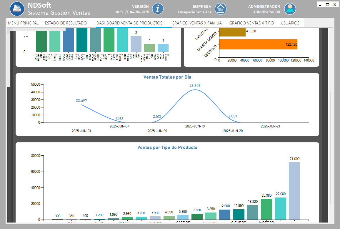 El dashboard de productos te ofrece información valiosa de un vistazo, mostrando los 10 productos más vendidos, el detalle de ventas por día y los pagos por tipo, lo que te permite optimizar tu inventario y estrategias de marketing.